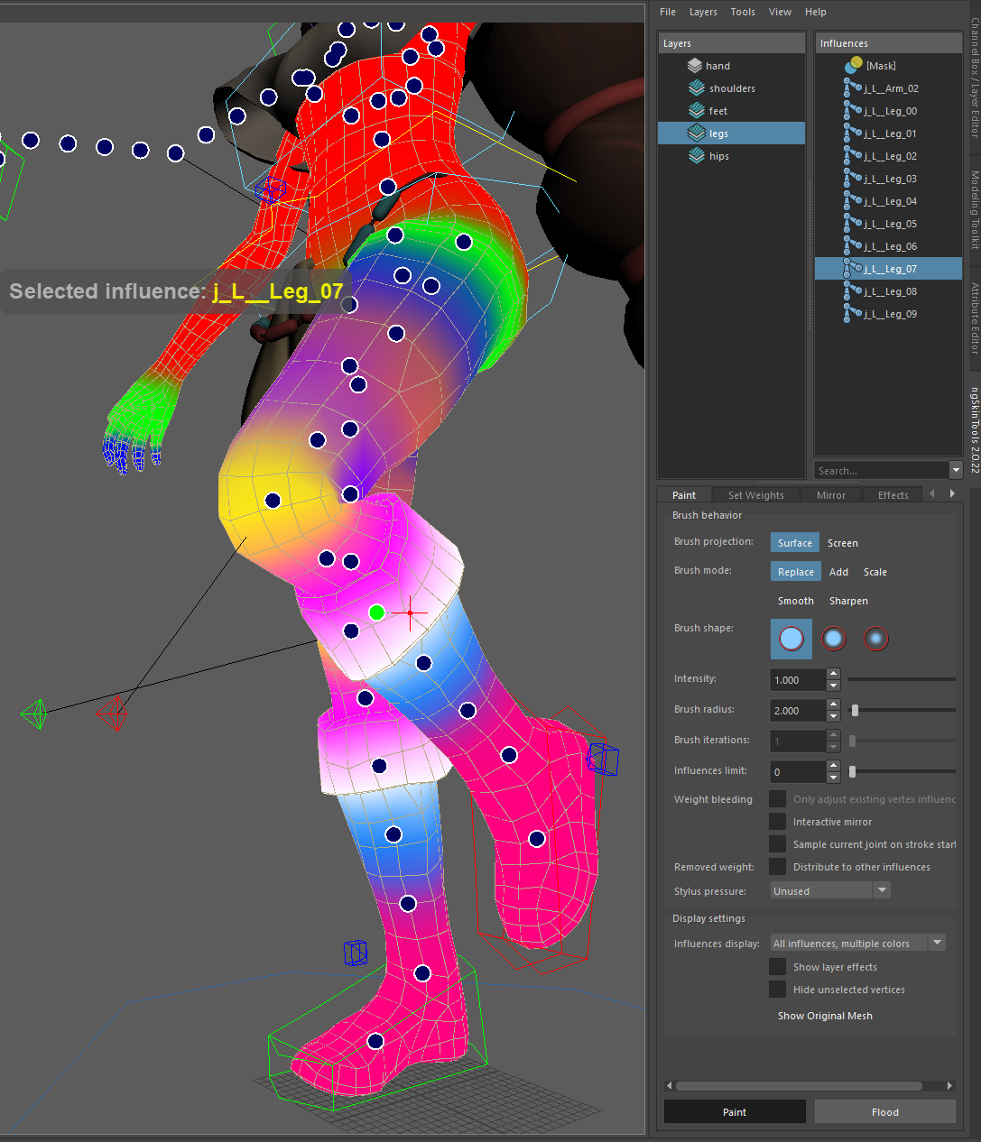 Just like in the previous version, ngSkinTools brings its own weight painting tools. Improving viewport experience is the main focus of V2, and it's complete revamp over the previous implementation.